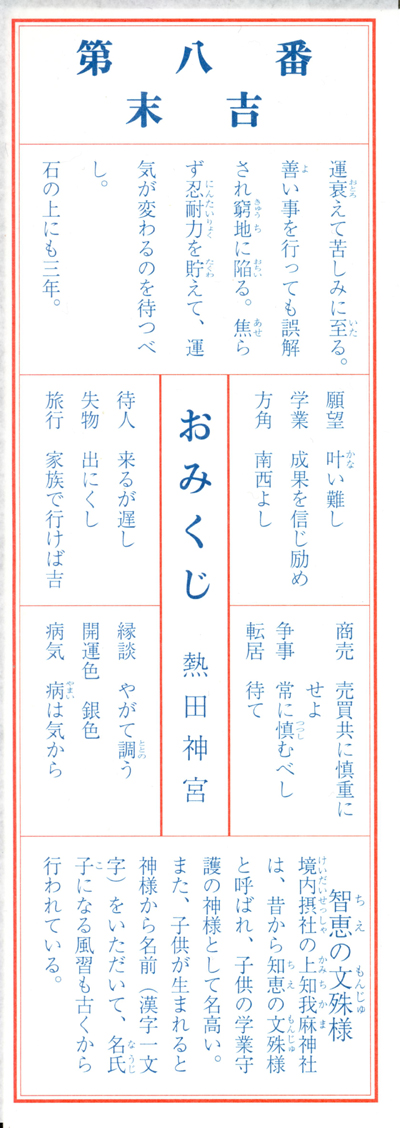 で、せっかくなのでおみくじをひいてみところ、 …。 苦しみに至るのかぁ、、。 善いことを行っても報われないのかぁ、、。 幸先よくない。 忍耐の年になりそうな予感がするなー。 それにしてもこの手のおみくじは、 数年前にもひいた気がするなぁ(>_<) 何かに憑かれている気がするぞぉ。 ----- 2009/01/03 14:51 くぅ。 inオレンチ →掲示板でコメントする |