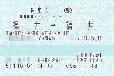 合成じゃないよ。 実はこんな買い方ができるんだねー。 どこでもできるわけではなく、 福井ではたまたまできただけ。 都内だと行き先しだいでは可能。 ええっ、どういうコト?!と思われた方、 経由地に注目してみて。 この切符のなぞの答えはコレ。 地理に詳しくない人にはピンとこないかもしれないけど、 実は福井から北陸線で日本海側を北上して、 新潟県を経由して上越線を南下、都内へ。 その後東海道線で太平洋側を通って米原から福井という行程。 つまり往復ではなくくるっと一周しているというわけ。 往復よりも断然安い。 調べてみると、 コレはマニアの間では一筆書きといわれていて有名らしい。 で、さらに調べてみると、とてつもない先人がいた。 http://railway.cocolog-nifty.com:80/denshaku/2010/01/post_008b.html す、すげぇ。 ----- 2009/06/12 22:59 ねむい。 in急行能登 →掲示板でコメントする |
