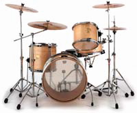 ♪HIROが唯一自信を持って演奏できる楽器です。相当こだわりを持っています。見てのとおりたくさんのたいこがついています。シンバルは右奥からハイハット、クラッシュ、ライド、クラッシュライド。中央の大きなたいこはバスドラムで足で踏んでリズムを得ます。右奥のたいこが前述のスネアドラム、その手前がタムタム、左奥がフロアタムです。