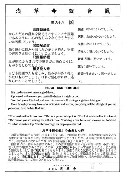 なかなか素敵な街でありました。 まぁ、そんな話はどうでもよいのです。 浅草寺で一幕。 ひさびさにおみくじでもひいてみよう、となけなしの100円をはたいておみくじに挑戦。 以下おみくじより抜粋です。 第九十八 凶 [願望:]叶いにくいでしょう。 [病気:]おぼつかないでしょう。(The sick person is hopeless.) [失物:]出にくいでしょう。 [待ち人:]現れないでしょう。 [新築・引越し:]悪いでしょう。 [旅行:]悪いでしょう。 [結婚・付き合い:]悪いでしょう。 おみくじなんて鼻かんで捨ててやるよ。 ふんだ。 |