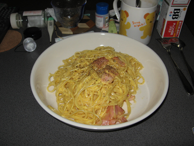 この料理、単純なワリに奥が深い。 お店に行くと1つとして同じ味はない。 そこで初めてのパスタ屋に行くと必ずこれを頼んで味比べをしてしまう。 自分のやつとお気に入りの店のとを味比べして、 味を盗んだりもする。 まぁ、そんなこんなで、 オレはオソラク数百食以上のカルボナーラを作ったんじゃなかろうか。 結果、2種類のカルボナーラを作れるようになった。 そして先日。 クリームと卵、チーズの比をいじってテストしてみたところ、 3種類目のカルボナーラができてしまった(^^) ふっふっふ。 そのうちカルボナーラ専門店を開いてやるんだ。 ----- 2009/06/25 22:56 寝るか。 inオレンチ →掲示板でコメントする |